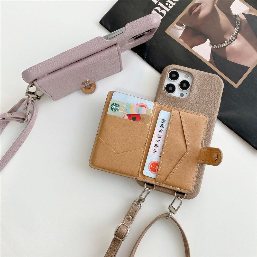 【iPhone14シリーズ対応】カードケース付 クラシック レザー風 ショルダーストラップ iPhoneケース(IC250)